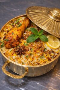 South Asian rice dish featuring long-grain basmati rice layered with spiced marinated meat (chicken, mutton, beef), vegetables, or seafood